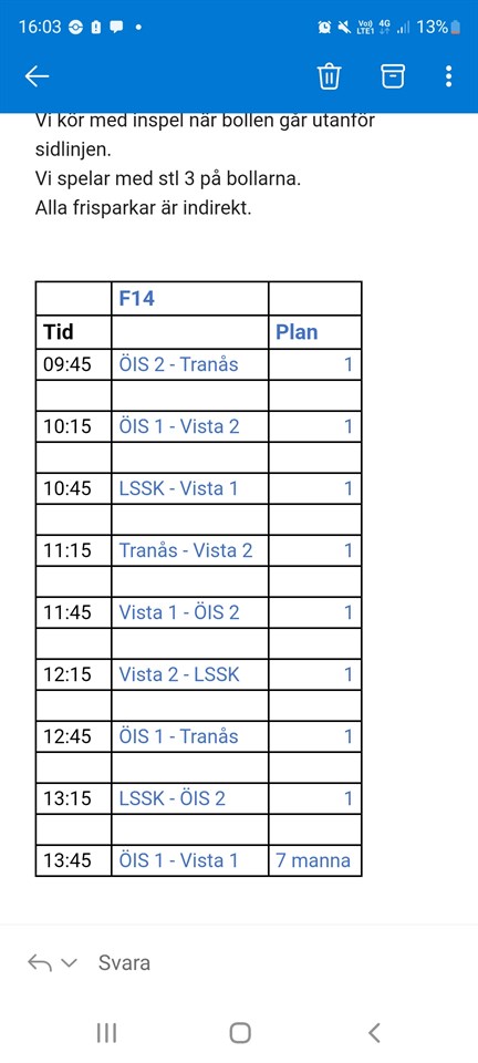 Nästa lördag gäller det. Fotbollens dag i Ölmstad vi hoppas på fint väder. Samling vid 9.30 vid Lssk för utdelning av matchtröjor, kom i blåa shorts och strumpor om ni har. Ni som inte anmält er gör det snarast så vi vet att vi har ett lag. Blir 3 matcher, se bifogad bild. Mvh ledarna
