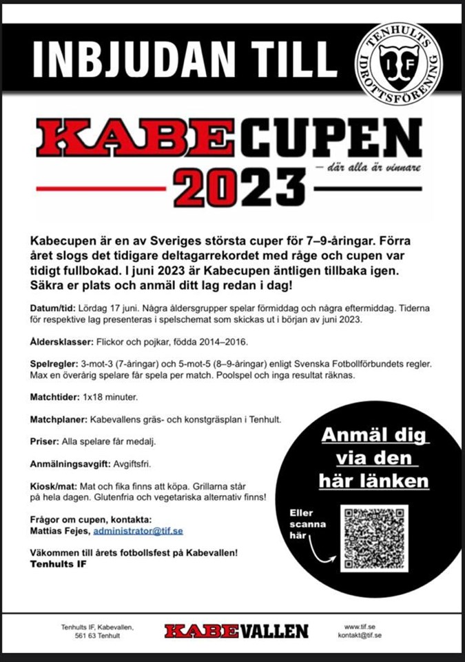 Hej alla Ledare! Hoppas sommaren har varit fantastisk! Nu drar fotbollen igång igen. Nu kan ni anmäla er till Kabecupen 2023 där alla är vinnare. Cupen är för åldern 7-9 år. 2022 var det fler lag anmälda än antal platser så passa på och anmäl i god tid för att säkra er plats. Cupen är helt avgiftsfri. Inbjudan kabecupen 2023 Mvh Ungdomsutskottet Fotbollssektionen 7 aug 2022 0kommentarer