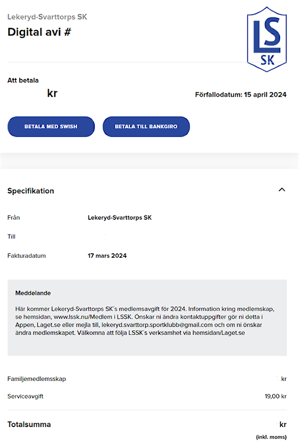I år är premiär för LSSK att skicka medlemsfakturor vi Appen Laget.se där nu också medlemsregistret finns.