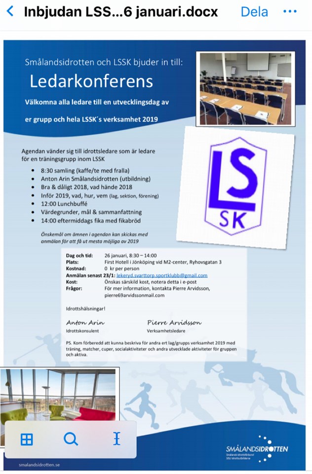 Är du tränare 2019 så är du mycket välkommen till ledarträff 26/1, 8:30-14:00 för att göra 2019 till ett kanon år för de aktiva i ert lag/grupp. Anmälan till, lekeryd.svarttorp.sportklubb@gmail.com senast 23/1, särskild kost noteras i anmälan. Varmt välkomna! Pierre Arvidsson, ordf huvudstyrelsen med sektioner